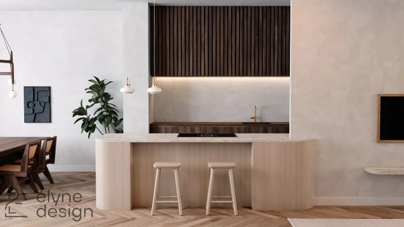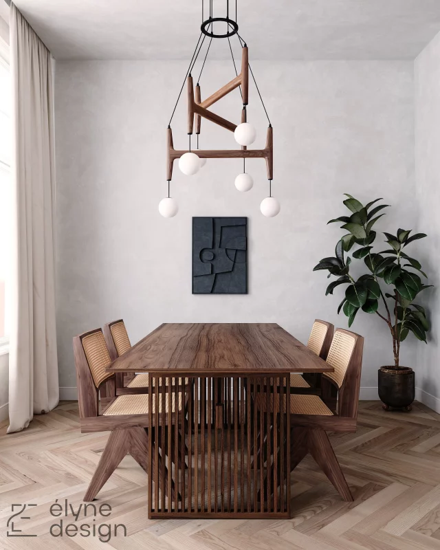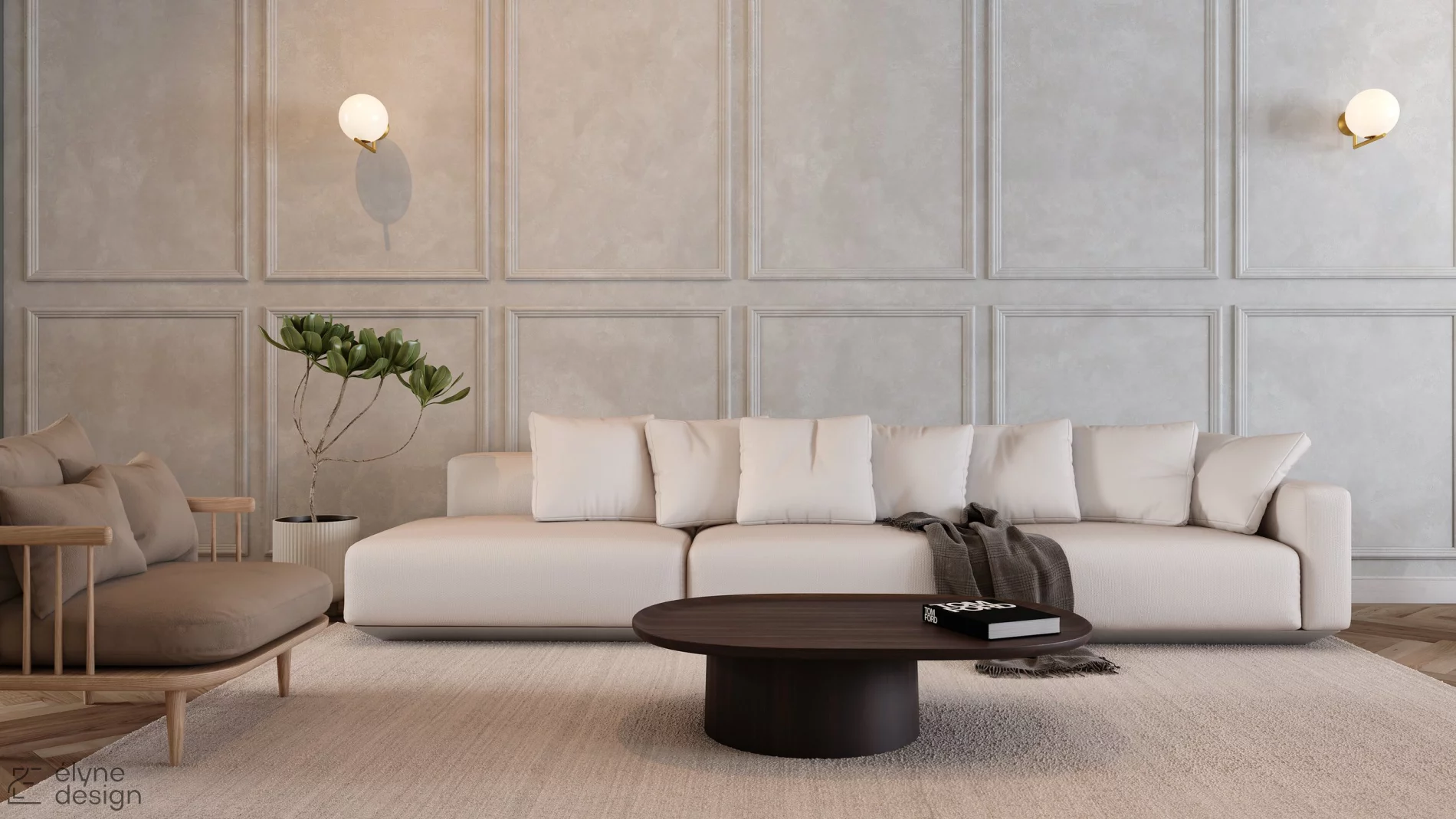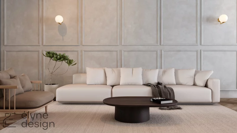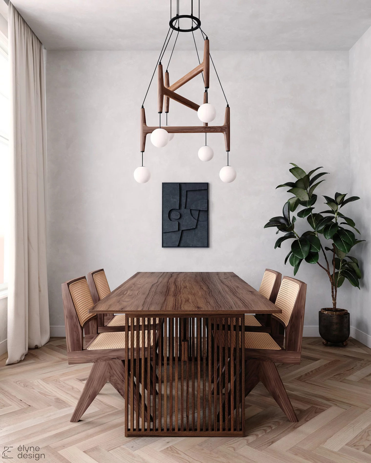 В отделке использованы натуральные и тактильные материалы: дерево, текстиль, матовые поверхности. Мебель отличается простой геометрией и выразительной фактурой, а декоративные элементы сведены к минимуму и работают как акценты, не перегружая пространство.